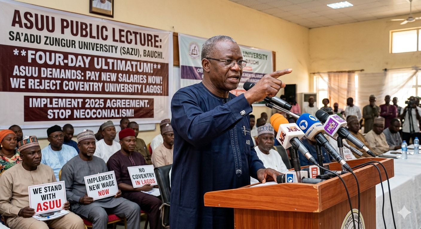 ASUU President Christopher Piwuna issued a four-day ultimatum to the Federal Government on March 27 during a public lecture at Sa’adu Zungur University in Bauchi. The union demands immediate implementation of the newly approved salary structure for university lecturers, agreed in December 2025 but still unpaid.