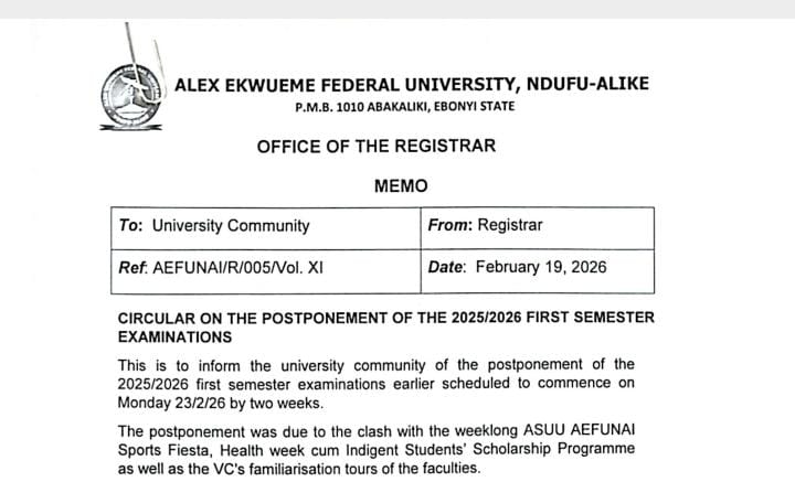 The management of Alex Ekwueme Federal University, Ndufu-Alike (AEFUNAI) has postponed the 2025/2026 first semester examinations earlier scheduled to commence on Monday, February 23, 2026.